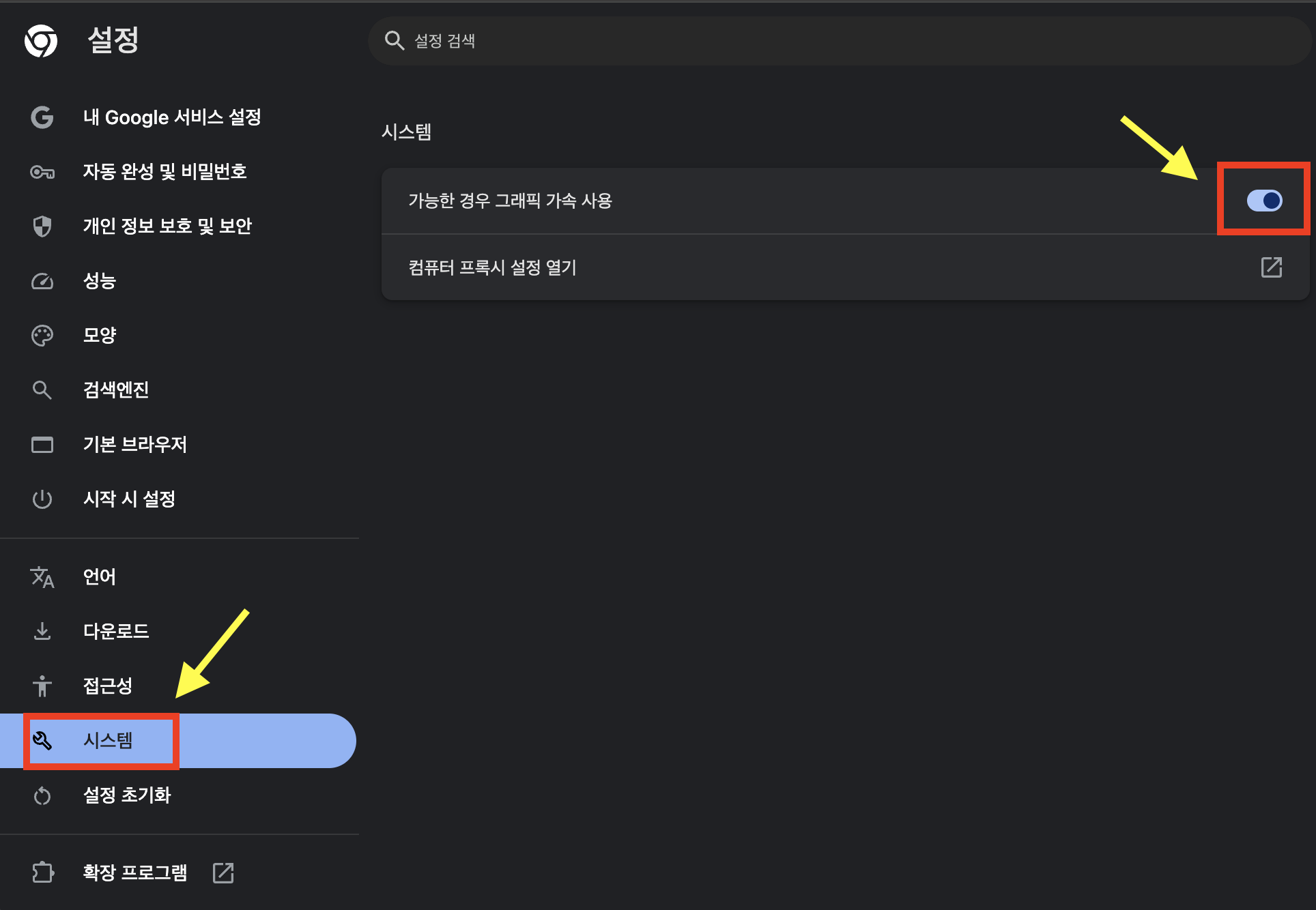 4. "가능한 경우 그래픽 가속 사용" 옵션을 켭니다 (토글 버튼이 파란색으로 변경되어야 함)