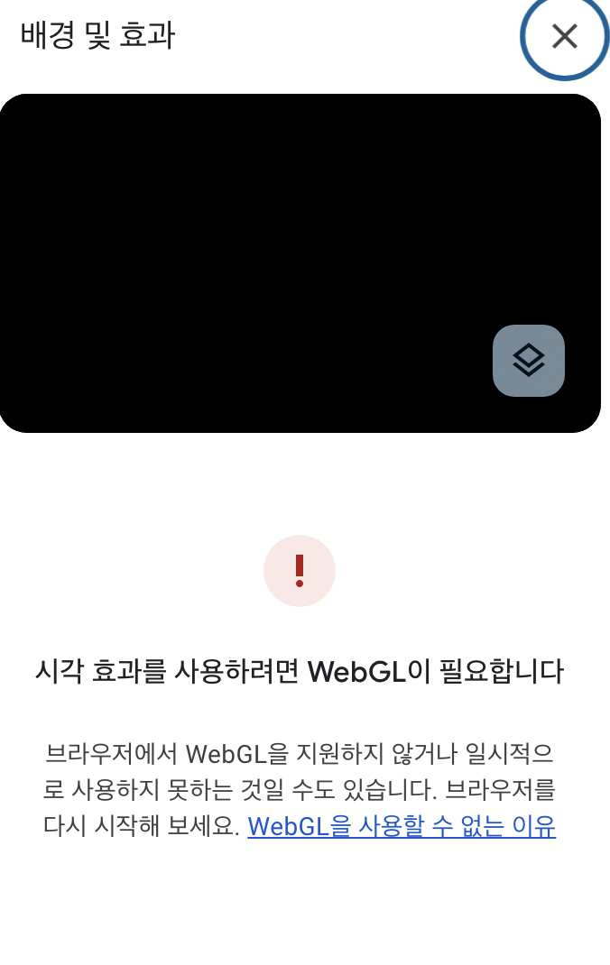 구글밋으로 미팅이 잡혀서 맥북으로 크롬에서 구글밋을 접속했는데요. 배경을 가리려고 구글밋의 "배경 및 효과" 기능 중 시각 효과를 사용하려고 했을 때, "시각 효과를 사용하려면 WebGL이 필요합니다"라는 오류 메시지가 떴습니다.