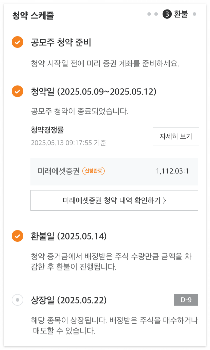 저는 돈이 없어 균등 배정을 노리고 최소 증거금을 넣어둔 상태이고, 단 하루도 오래 넣어두고 싶지 않아서 청약일 마지막인 5/12(월)에 청약했습니다.