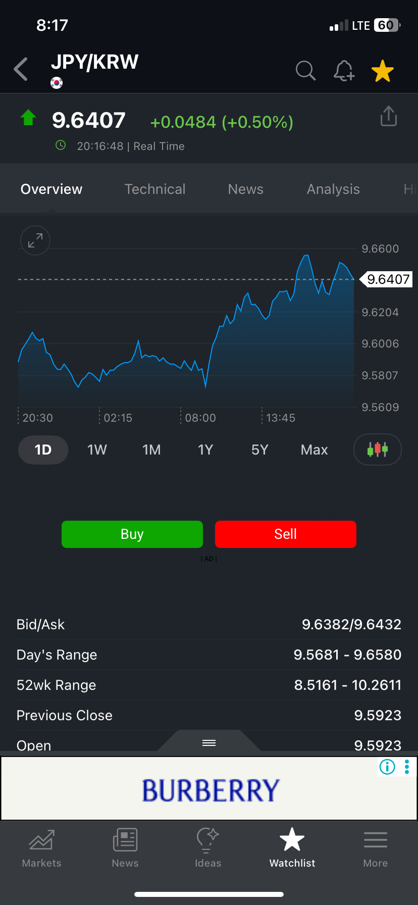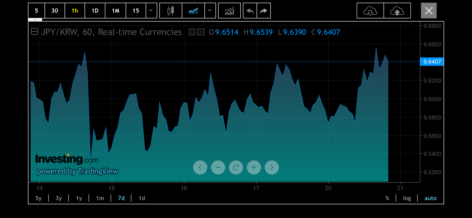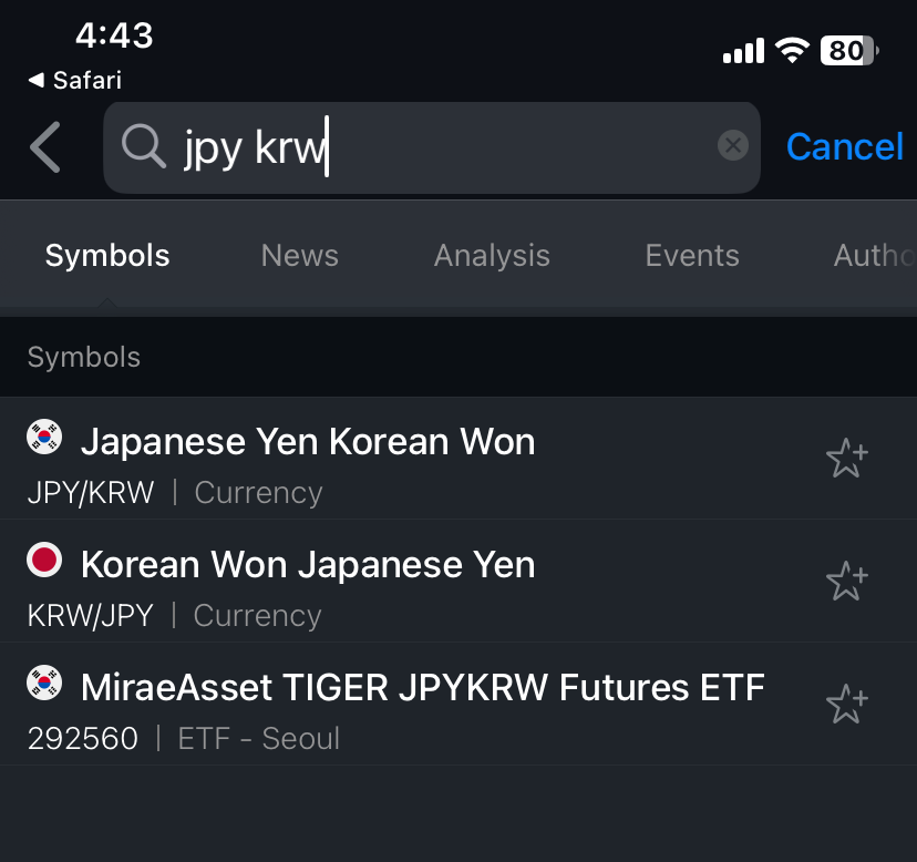3. 원하는 통화쌍 검색: 환율 (Forex) 메뉴로 들어가면 다양한 통화쌍 리스트가 보일 겁니다. 예를 들어, 엔화/원 환율을 확인하고 싶다면 검색창에 JPY/KRW를 입력하거나 목록에서 해당 통화쌍을 찾아 탭합니다.