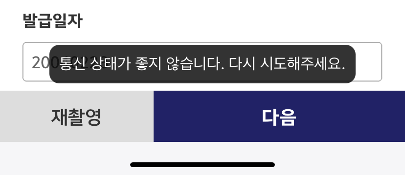 이 부분에 대해서 문의 결과, 기술팀이 메시지를 거지같이 적어놓아서 인데, 진짜 나왔어야 하는 메시지의 내용은 신분증이 제대로 인식되지 않아서 매칭이 잘 안되어 다음으로 못넘어가는 이슈라고 합니다.