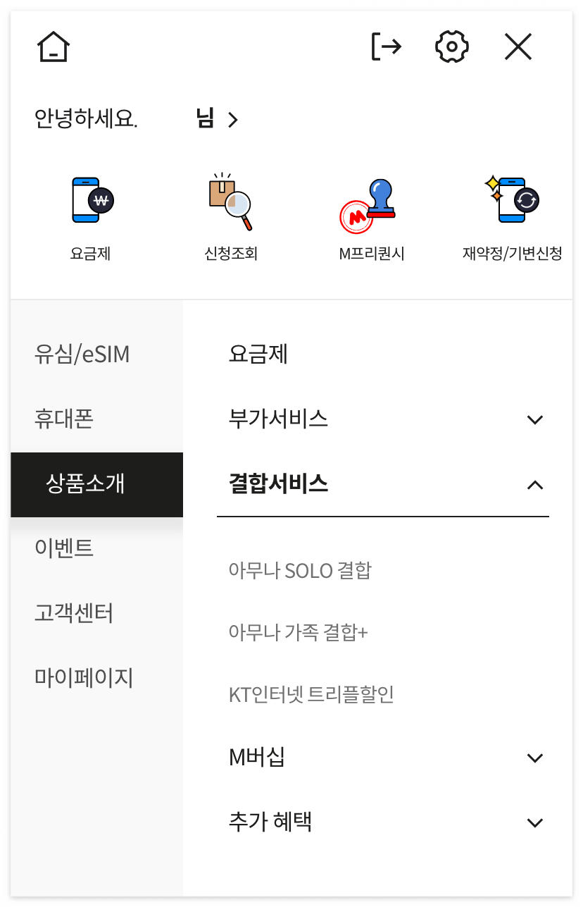 개통한 직후, KT M모바일 어플로 로그인합니다. 우측 상단 세 줄을 클릭하면 아래처럼 메뉴가 나옵니다.