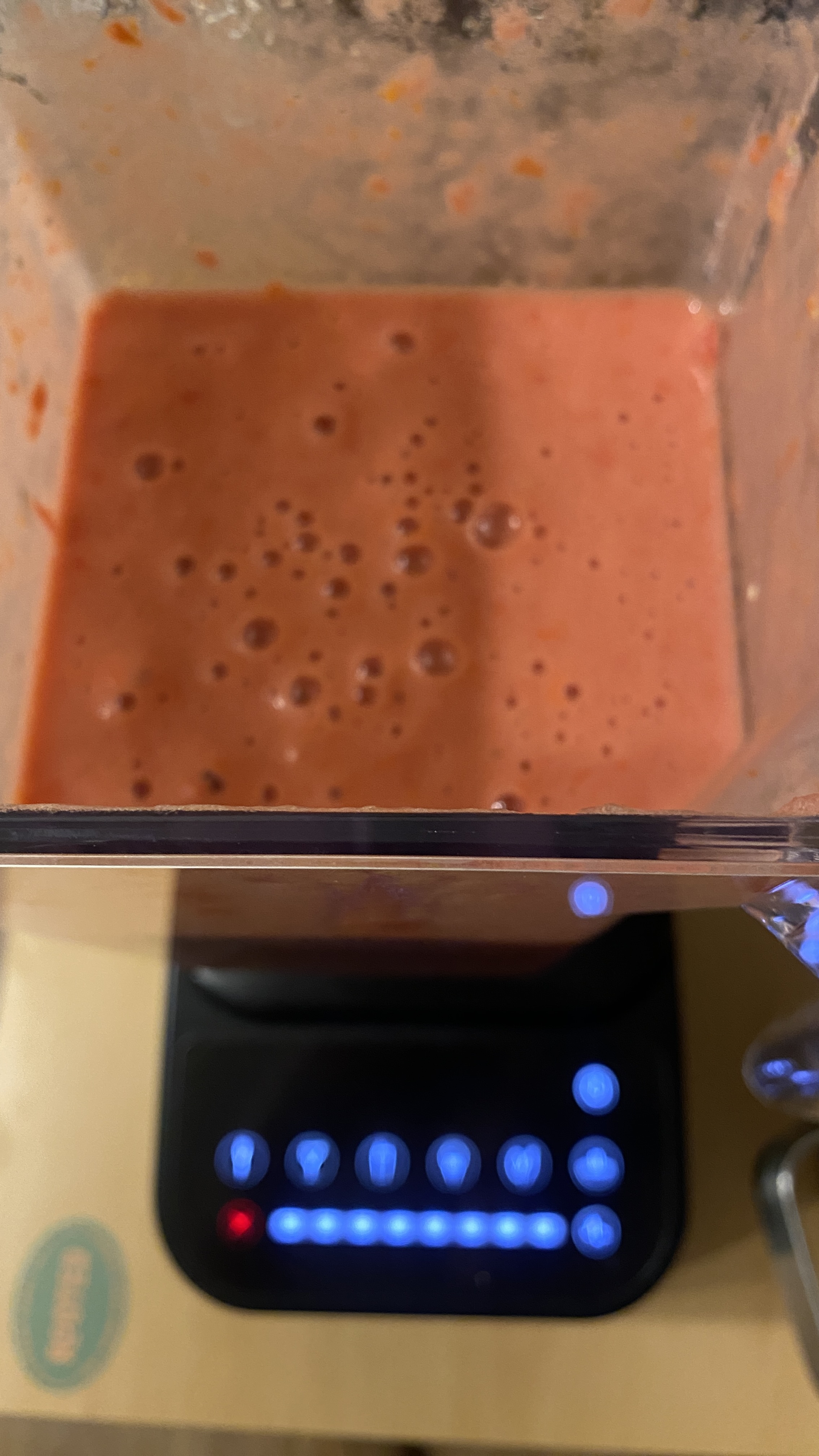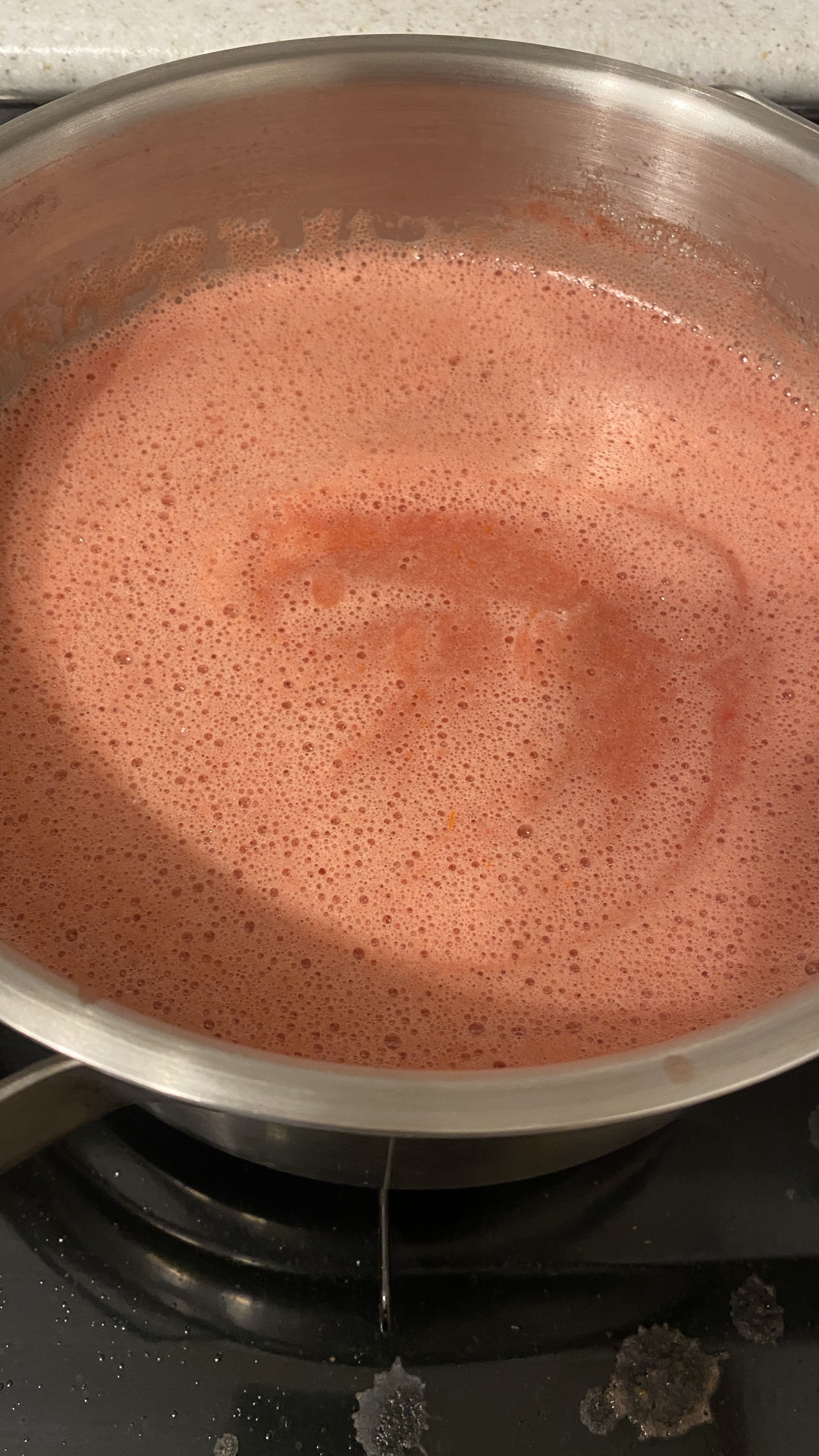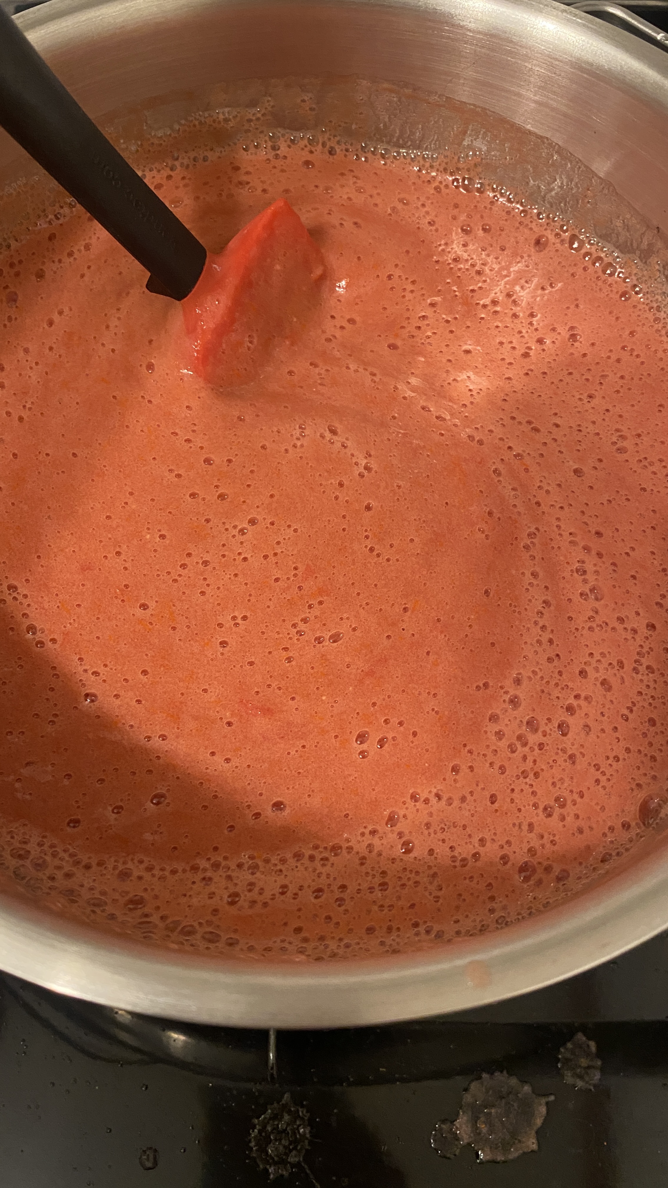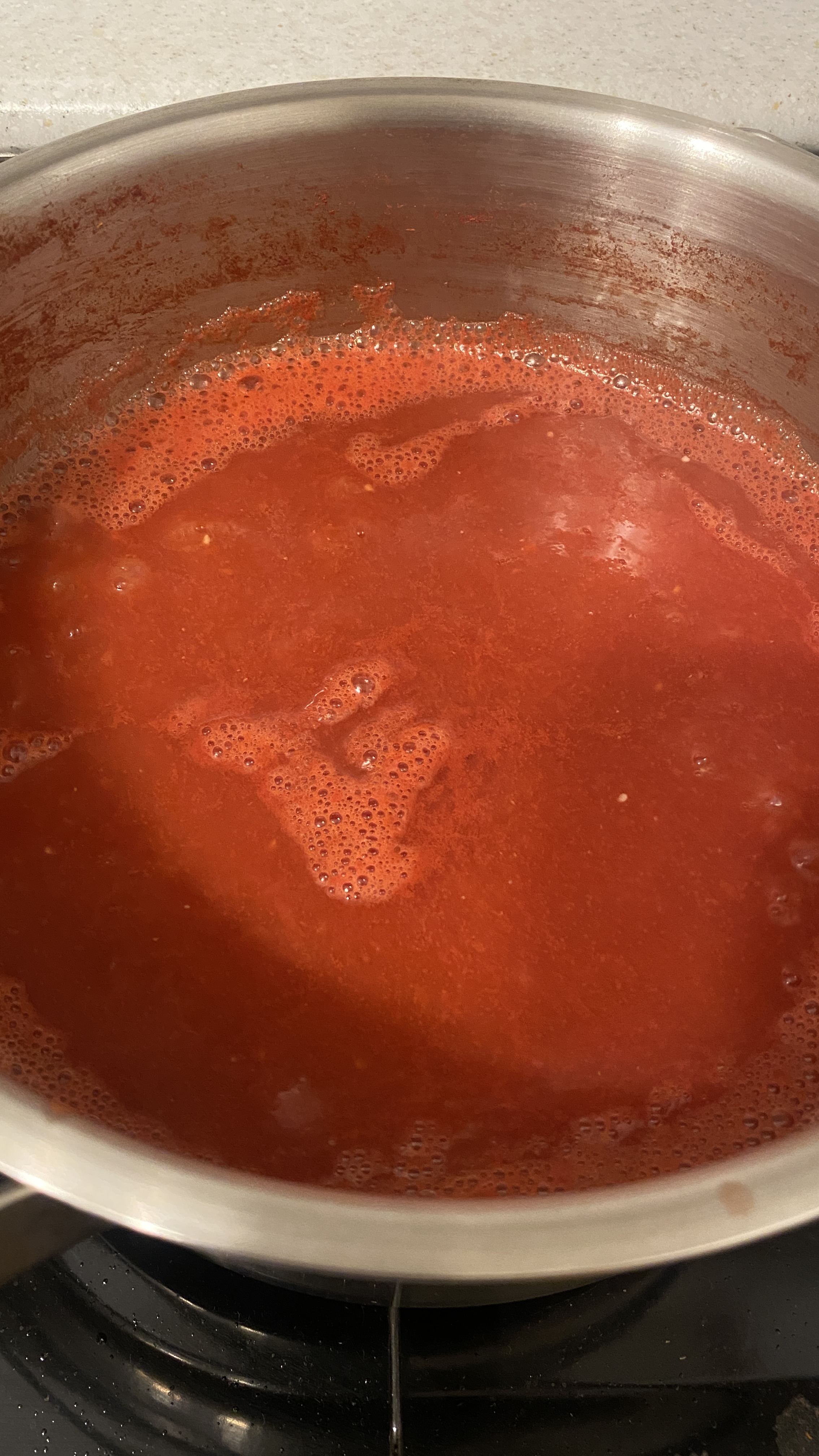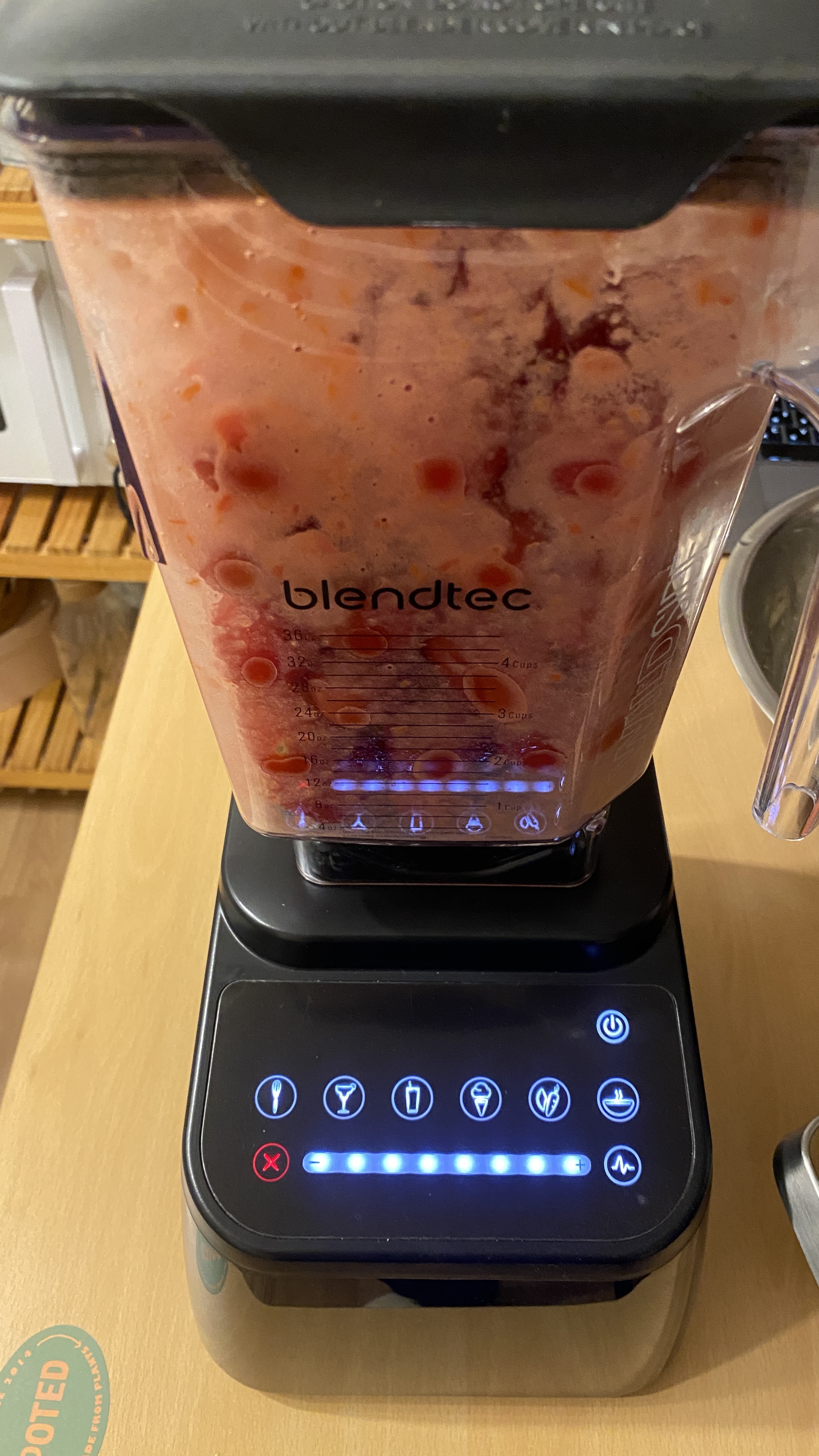 깨끗이 씻은 토마토를 믹서기에 곱게 갈아 냄비에 부어주세요. 이때 껍질째 갈아도 괜찮고, 원하는 경우 씨를 걸러내도 됩니다. 저는 껍질과 씨 모두 그대로 갈아버렸어요.
