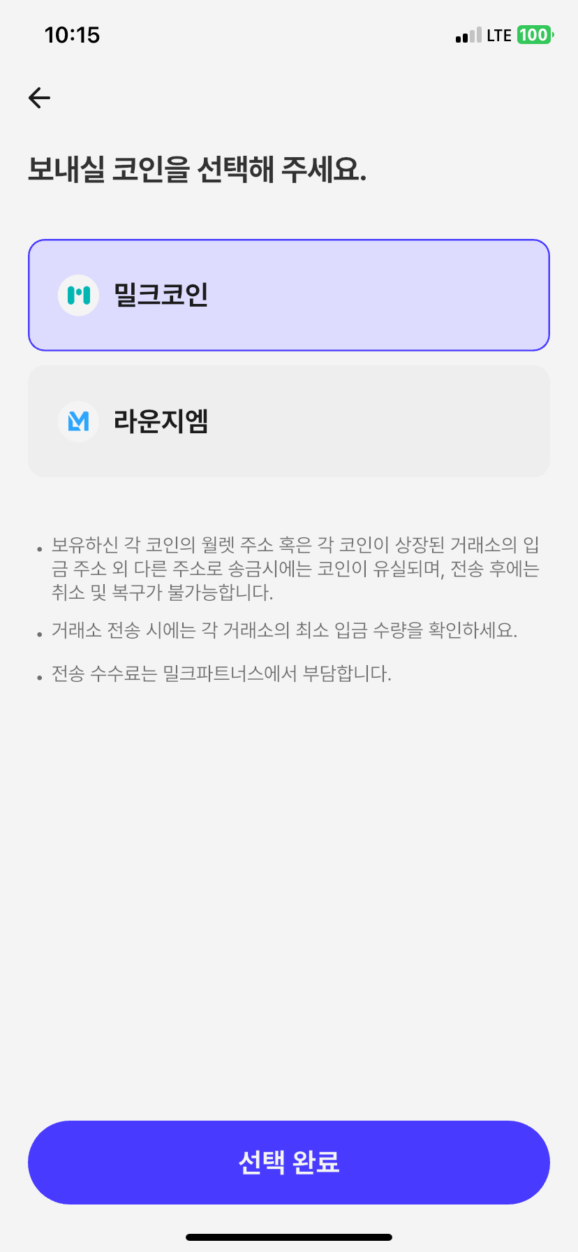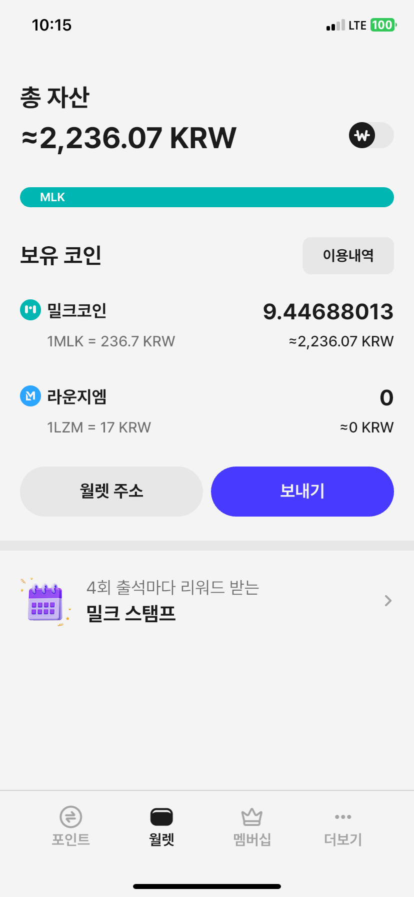 밀크 어플의 "월렛" 탭에서 "보내기" 버튼 클릭 → 보낼 코인으로 "밀크코인" 클릭 →