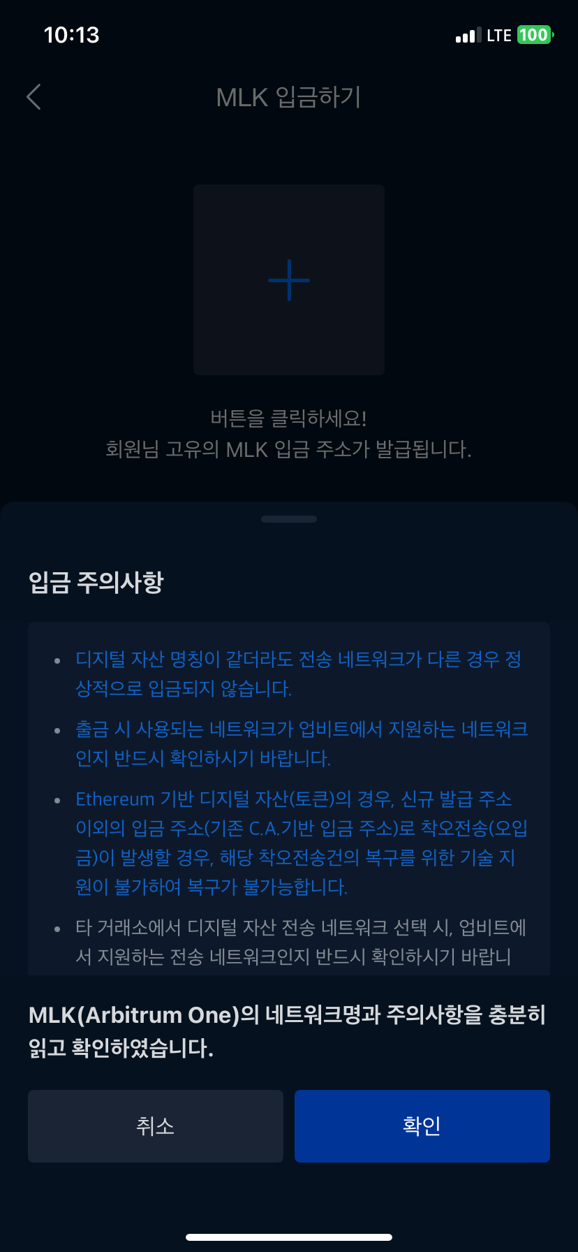 그러고는 쎄했던 부분이 "최소입금금액은 1MLK 입니다. 1MLK 미만 입금 시 잔고 반영이 불가능합니다"라는 문구였어요.