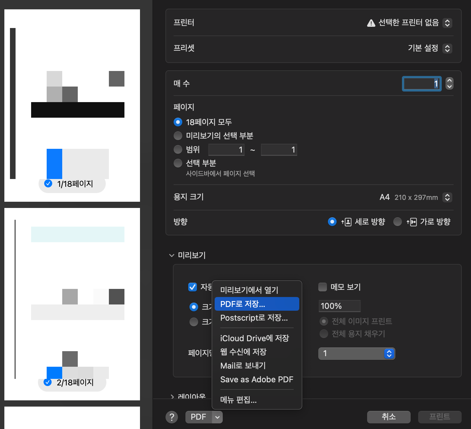 파일 > 프린트 > 하단의 "PDF" 클릭 > "PDF로 저장..." 클릭하여 파일명 입력하고 저장하시면 됩니다.