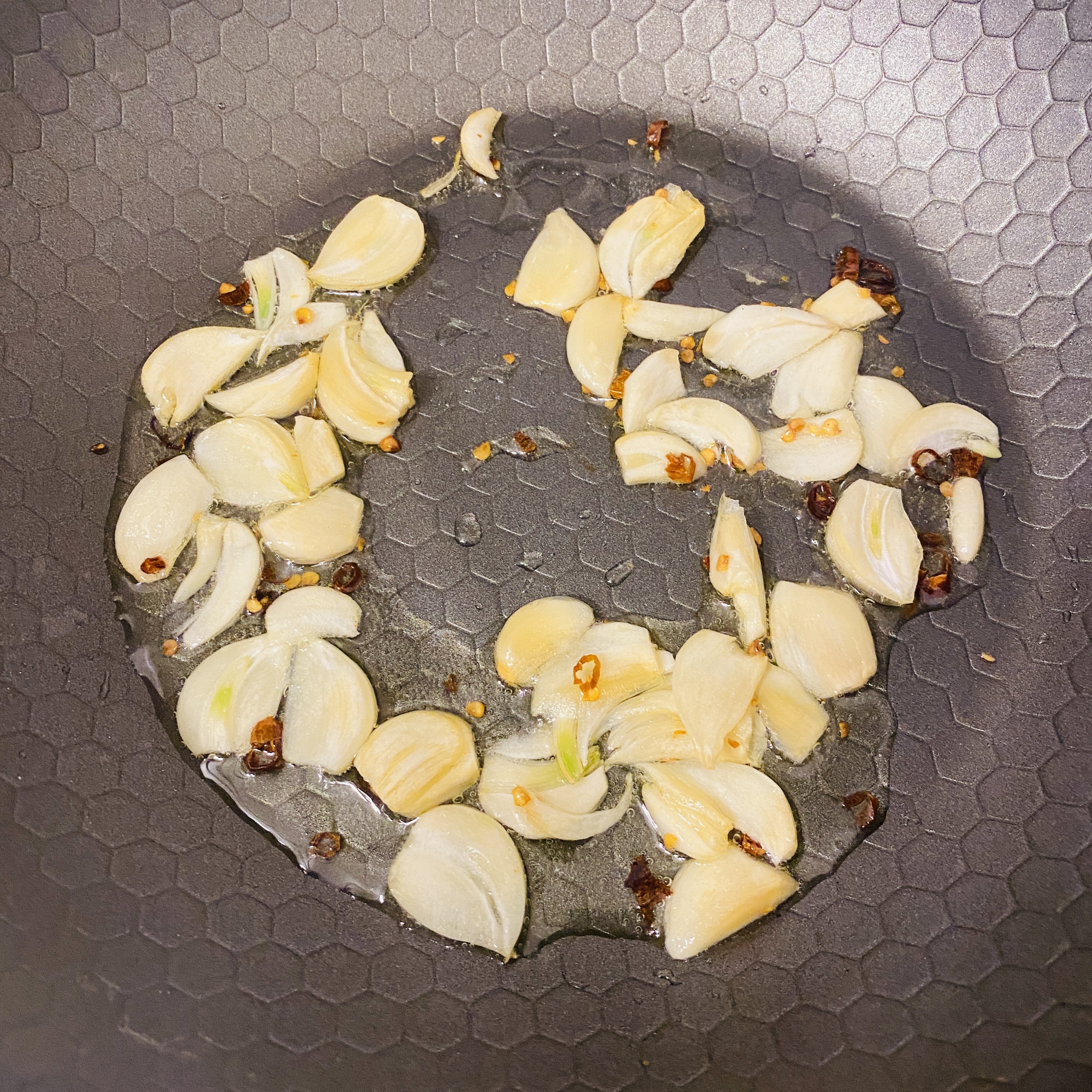 | 1-1. 편 썬 마늘, 가위로 자른 페페론치노를 올리브유 두른 후라이팬에서 마늘이 노릇해지도록 볶는다 1-2. 파스타면을 소금 넣은 물에서 삶는다 |