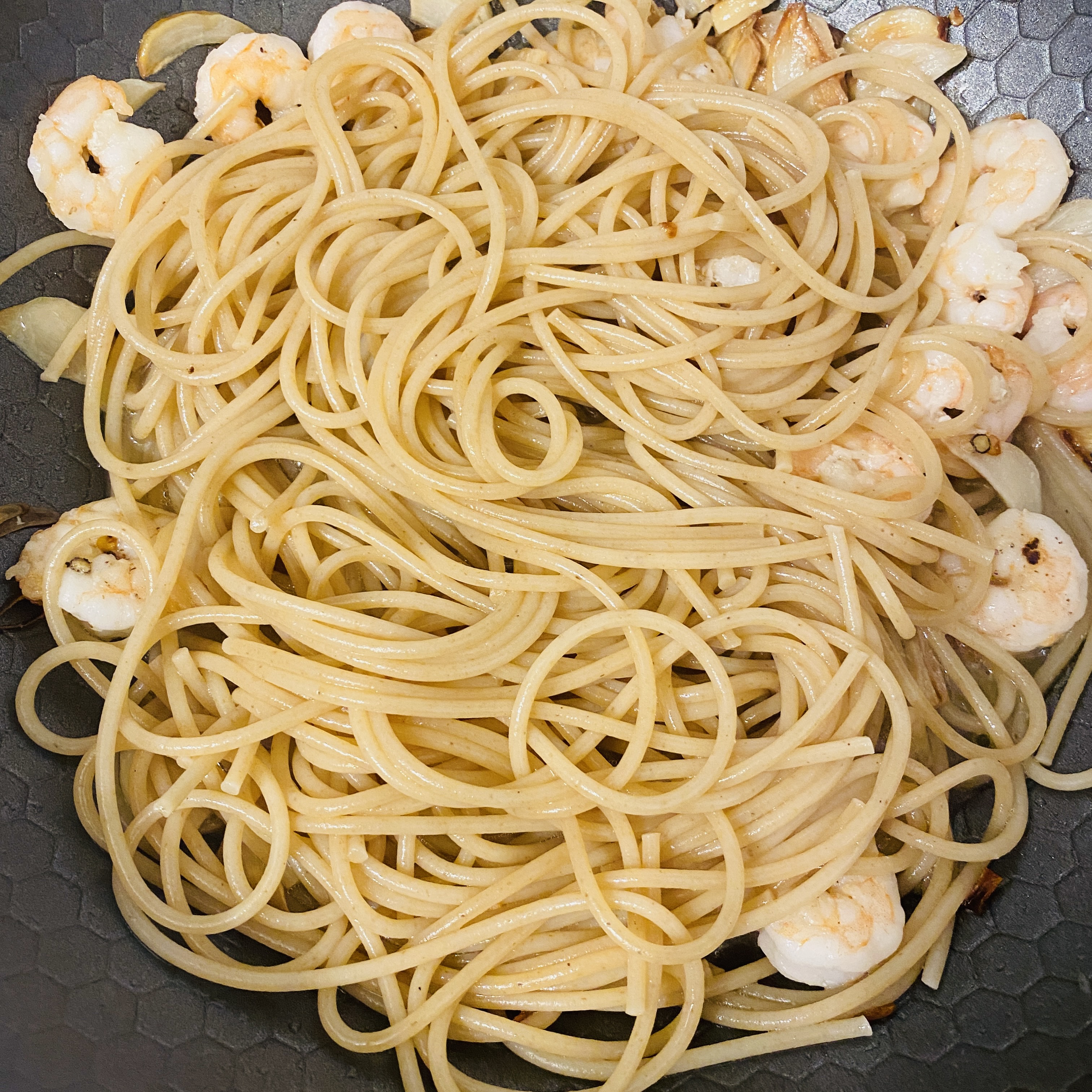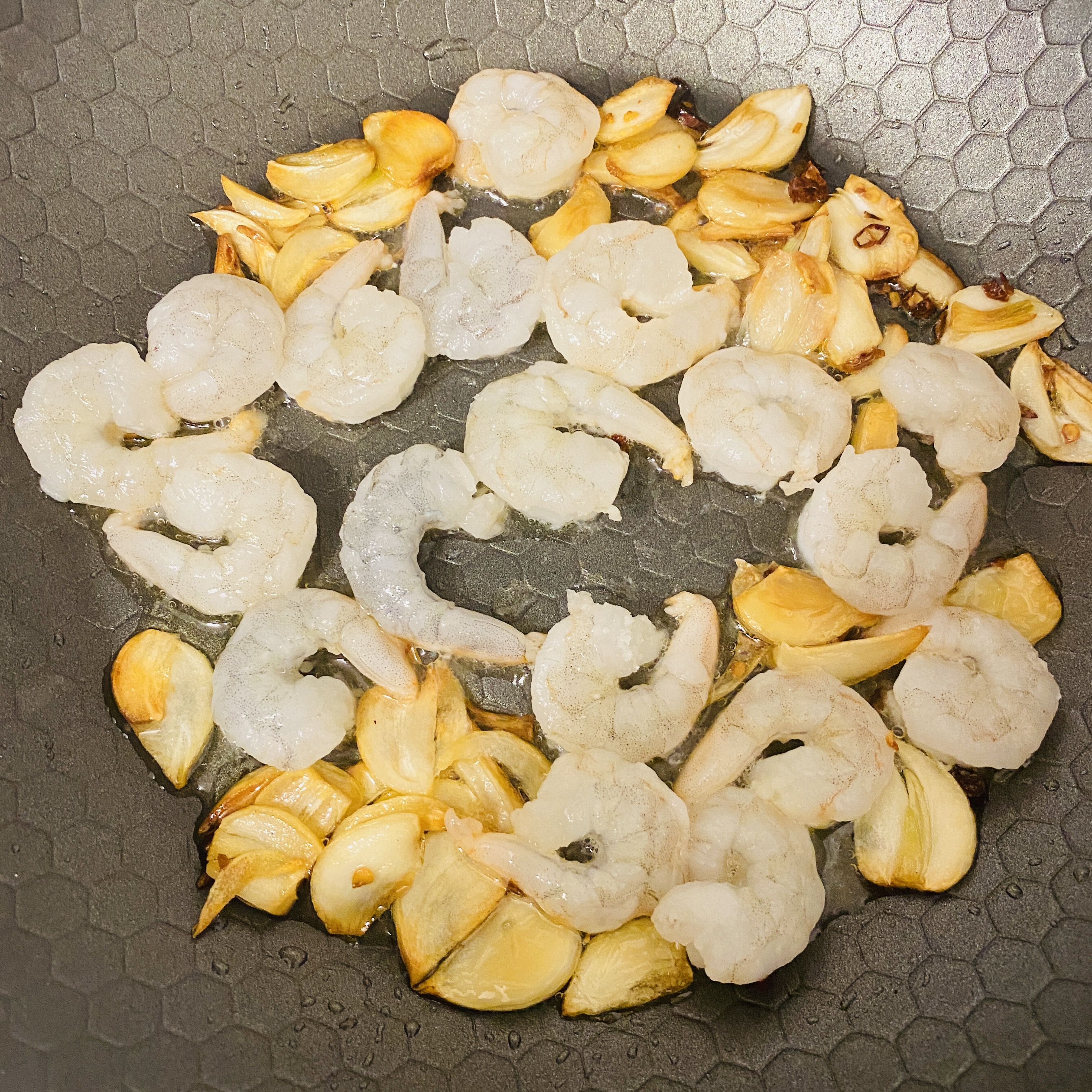 재료 : 냉동새우 두 주먹, 파스타 면 1.5인분, 마늘 5알 편 썬 것, 페페론치노 2개, 올리브유