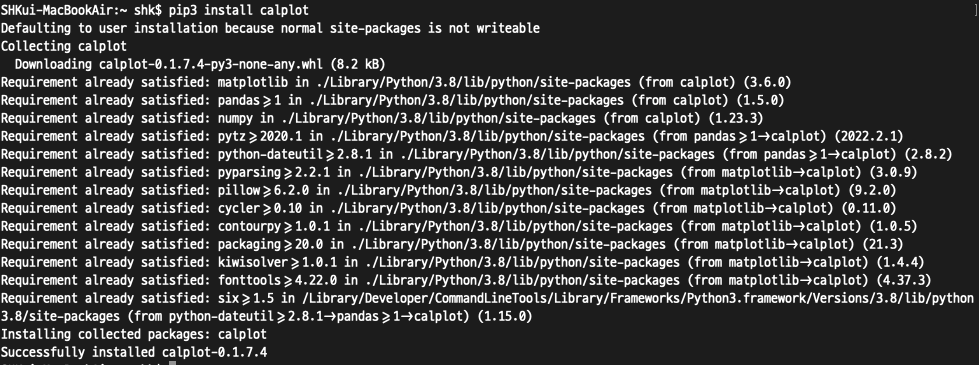 그리고나서 calplot 패키지를 설치하니 아래처럼 warning없이 깨끗하게 설치되는 걸 확인할 수 있었다.