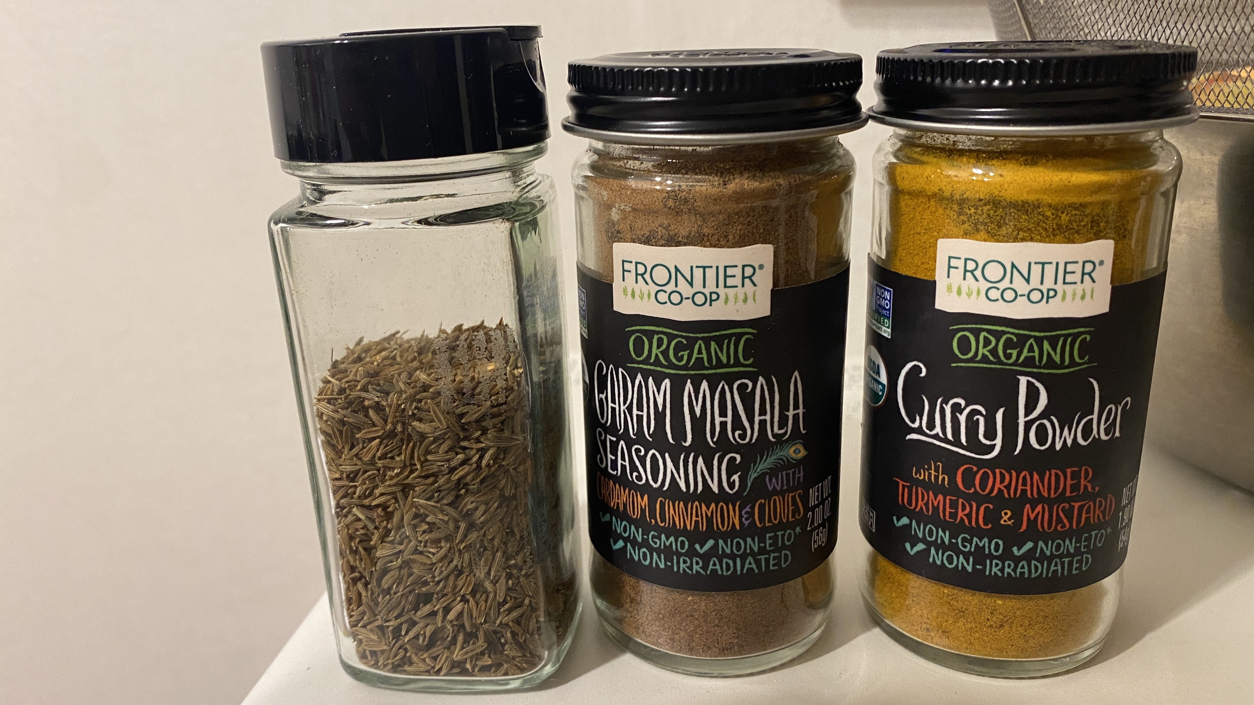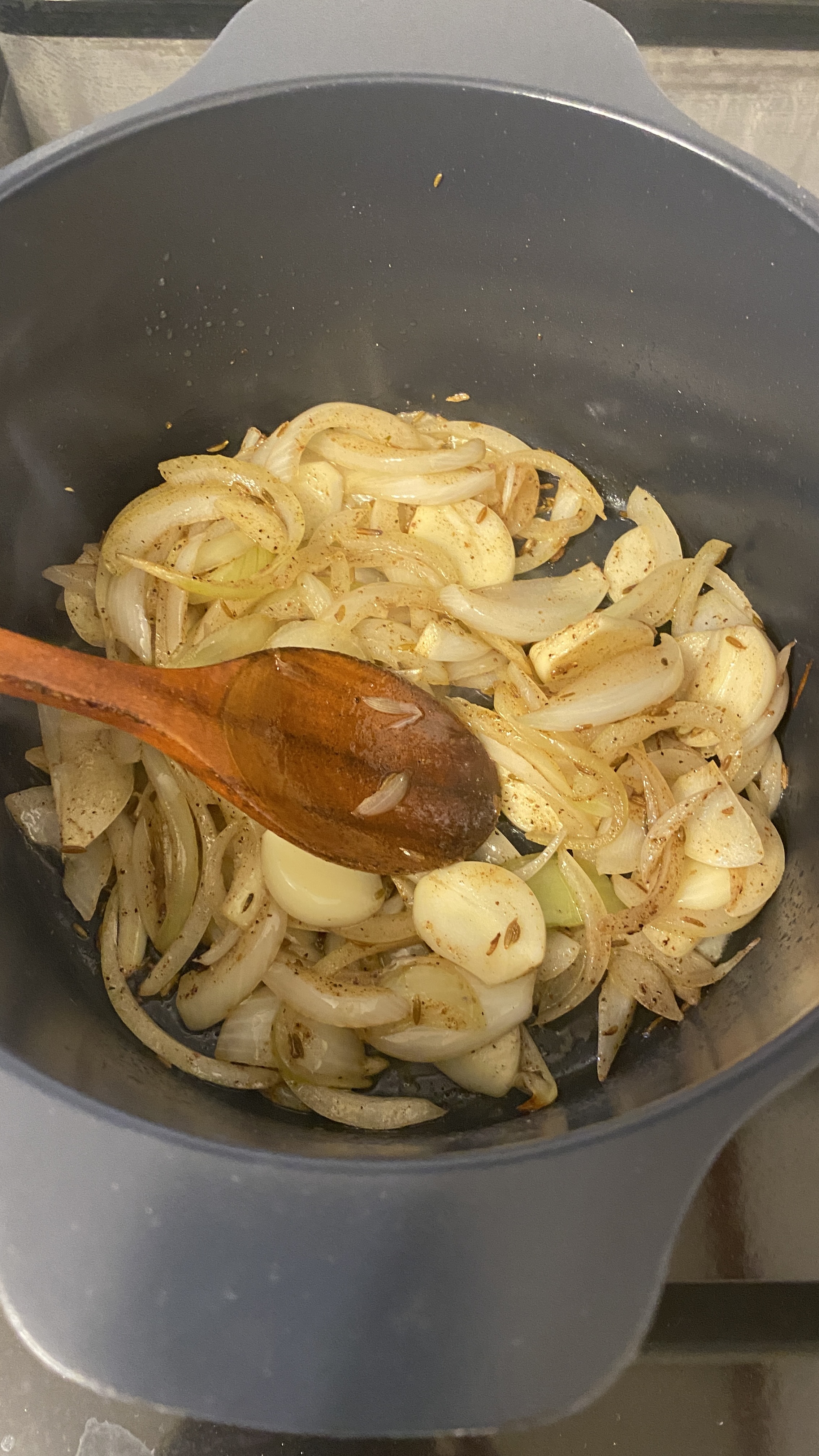 1. 냄비에 코코넛오일(아무 식물성 오일)을 두르고 양파, 마늘, 커민씨드, 가람 마살라 가루, 커리 파우더를 넣으며 잘 볶는다 양파와 마늘이 익는 향도 즐기고, 커민씨드가 기름에 구워지는 향도 먹음직스러운 향이 난다. 가루들이 하나씩 추가될 때마다 풍미가 더해지는 걸 냄새맡는게 생각보다 행복하다 |