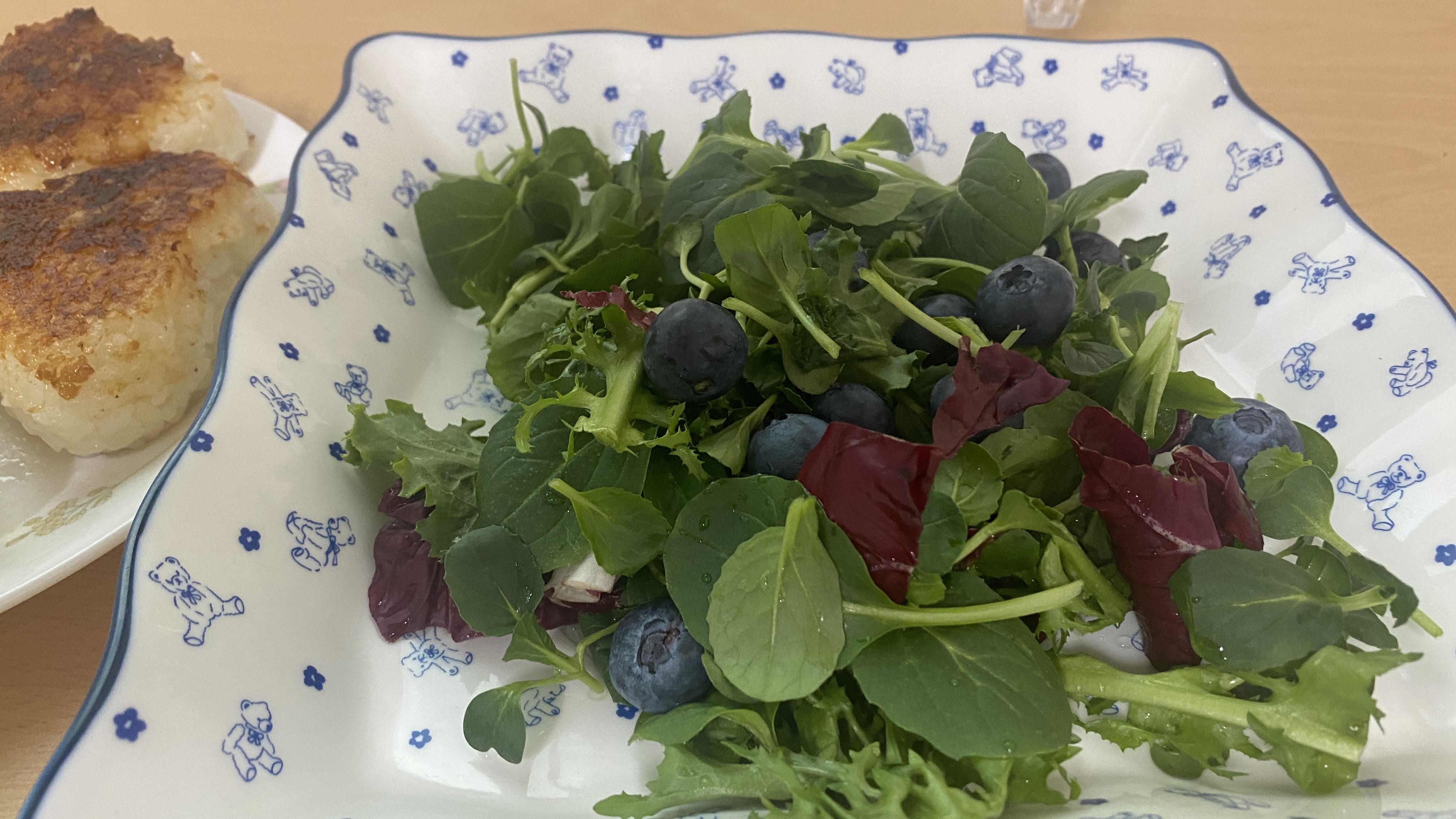 그래서 친구가 샐러드와 생 블루베리를 사와 맛나게 샐러드를 만들어 곁들였다.