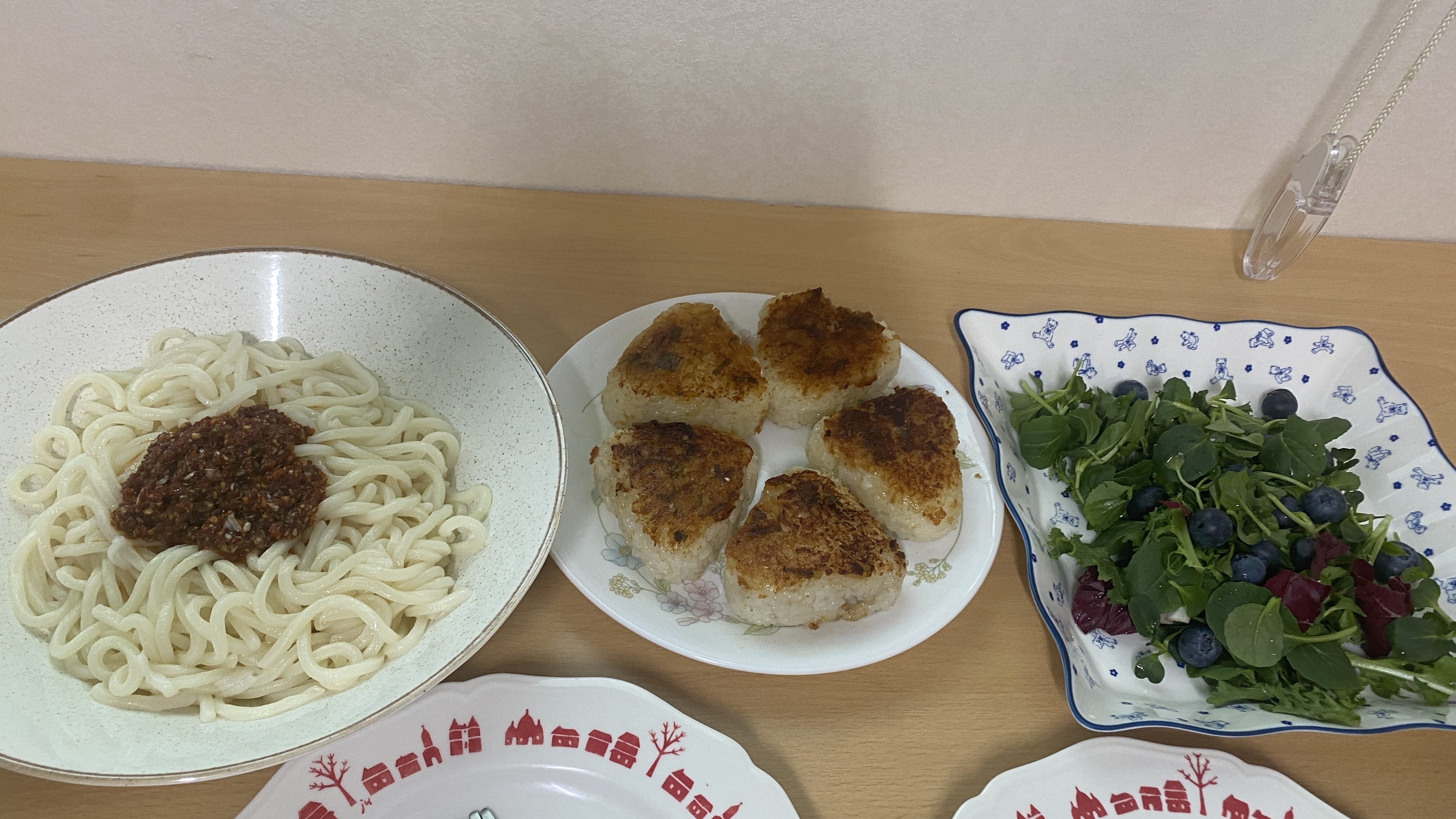 친구와 점심 - 대파미소 오니기리, 칠리칼국수, 샐러드