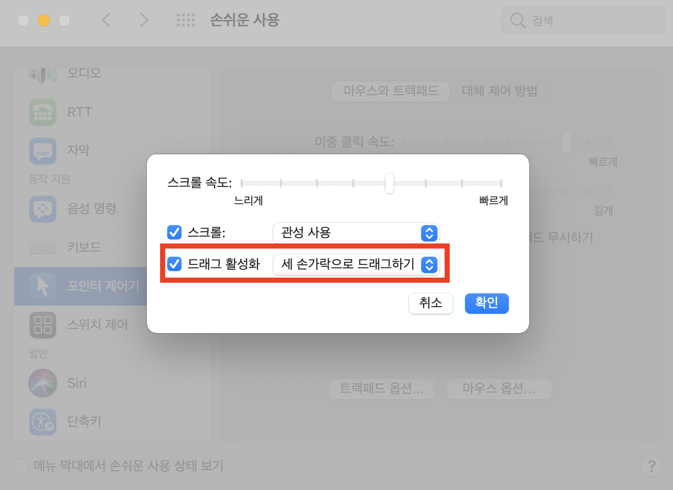 4. 드래그 활성화 > 세 손가락으로 드래그하기 선택