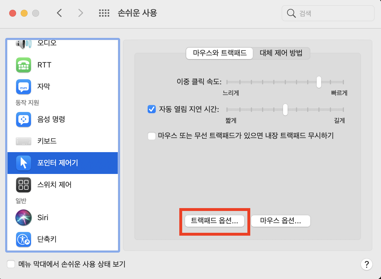 3. 포인터 제어기 클릭 > 트랙패드 옵션 클릭