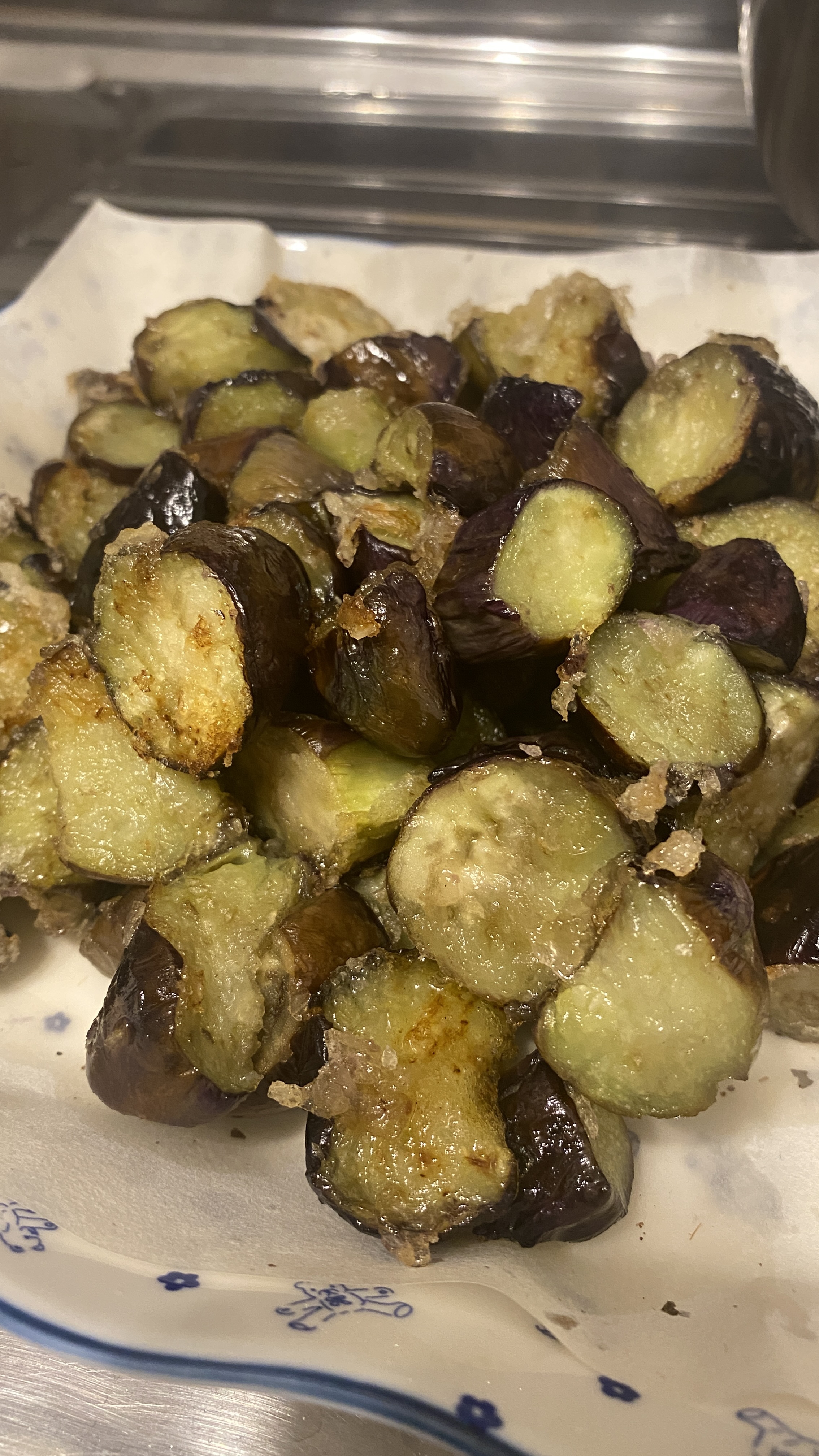 가지는 대충 토막내어서 전분가루에 굴렸다. 그걸 팬에 기름을 충분히 넣어 굽듯 튀겨냈다.