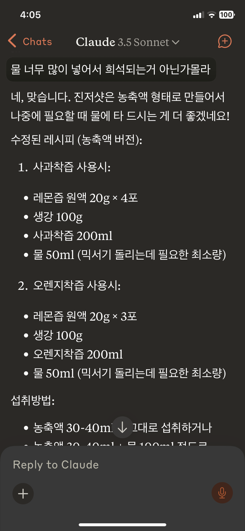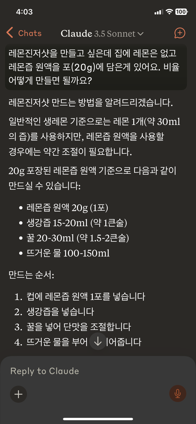 재료의 비율은 사람마다 달라서 난 클로드와 상의했다.